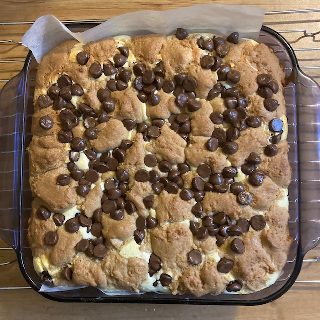 Dark Chocolate Cheese Cake Bars came about because I had to create a sweet dessert to repay a debt. My coach at CrossFit XBA let me skip Deadlift strength before the Metcon. I was being a baby and didn’t want to do them. The tradeoff was I needed to make these. Not really a bad trade because I got some myself. Dark Chocolate Cheese Cake Bars combines 2 great things the Chocolate Chip Cookie and the Cheese Cake! This combination was actually really good! The hard part about this one is not eating it right out of the oven because it smells amazing. They need to cool and then be refrigerated before being cut into bars. Best to refrigerate overnight! Not a difficult recipe and is made in an 8 by 8 pan, so you don’t get a large amount.