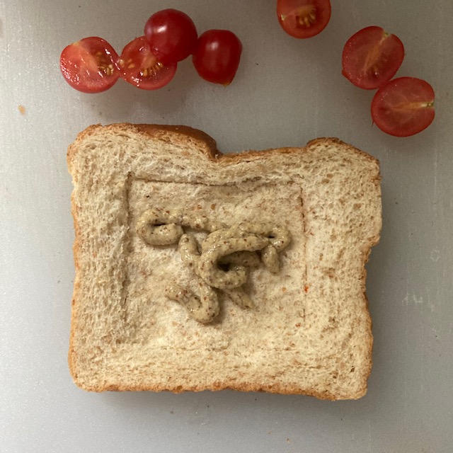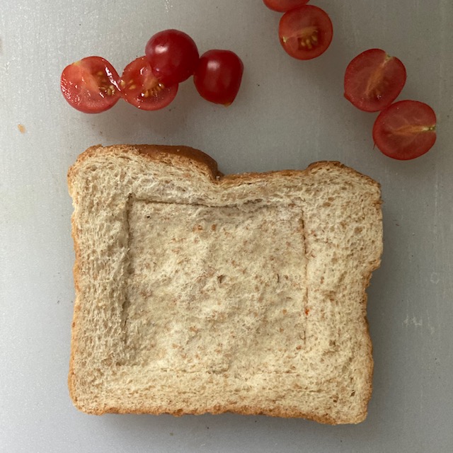 - Use a small knife to cut a square in each of the slices of bread, but not all the way thru. Just enough to make a square indentation.