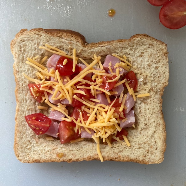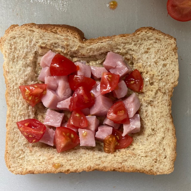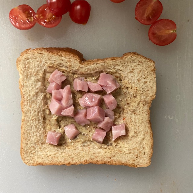 - Dice up the Grape tomatoes and the Ham into small cubes. Then add them to the Square, but try to leave the middle a little open.