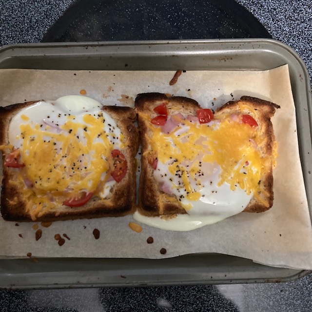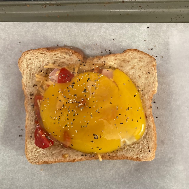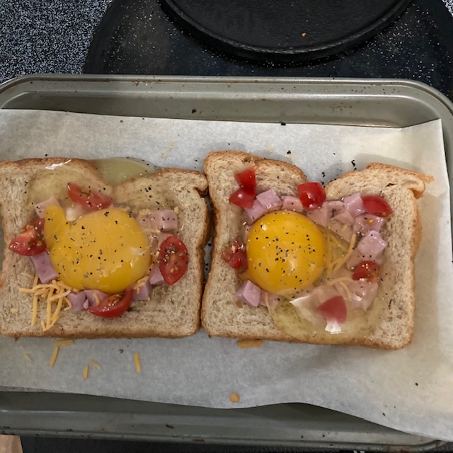 - Line a baking sheet with parchment paper and place the egg and ham toast on it.