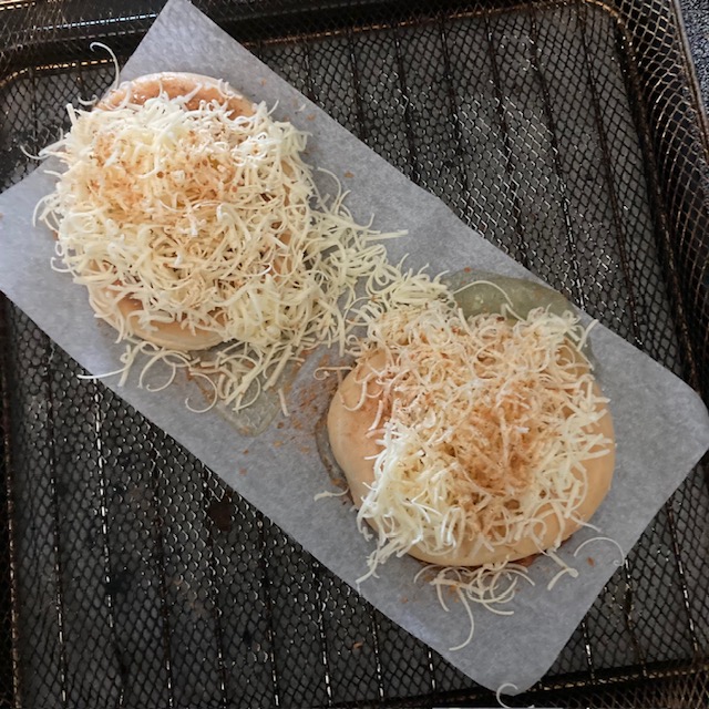 - Season the eggs with your seasoning and then sprinkle the cheese over the bagels.