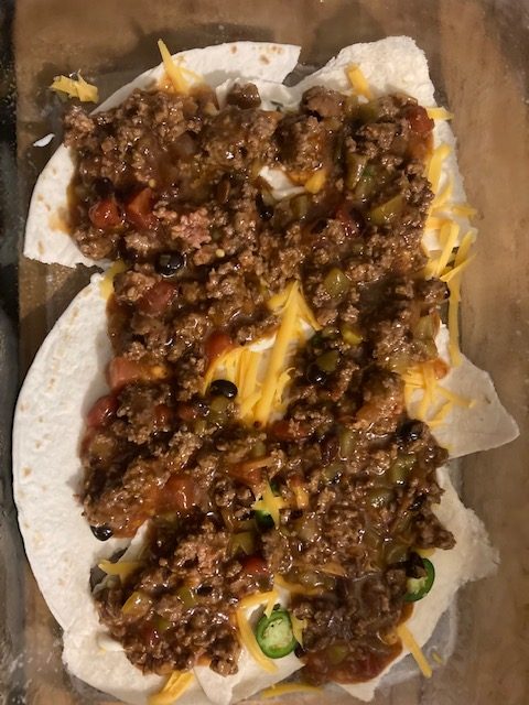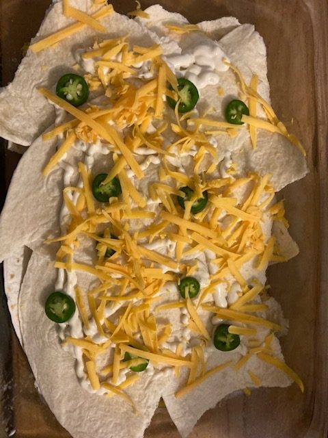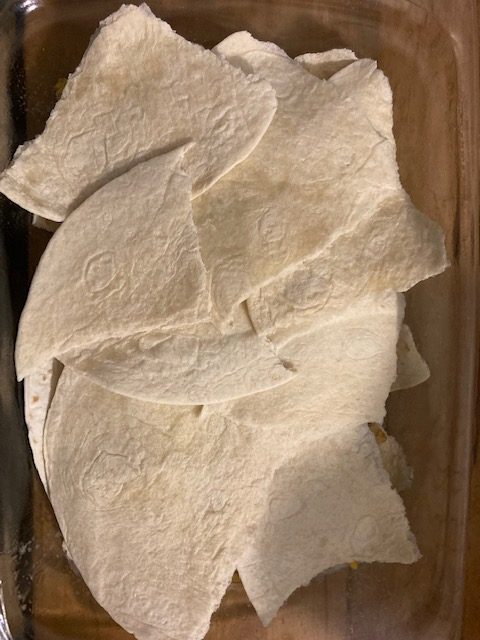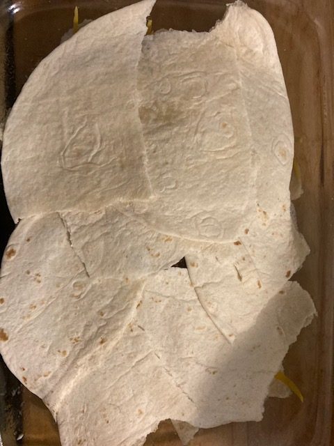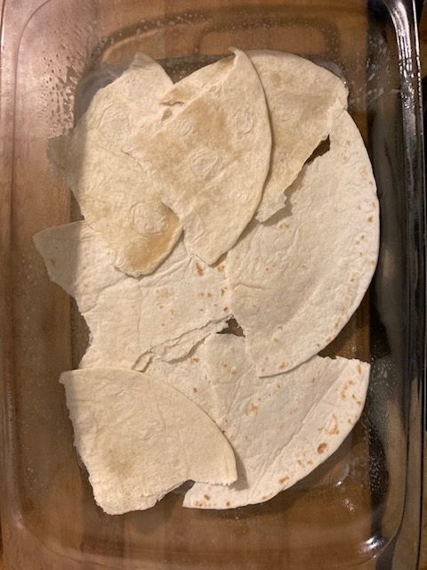 - Spray a 9 by 13 pan with cooking spray and put in 2 quartered up tortillas.
