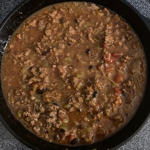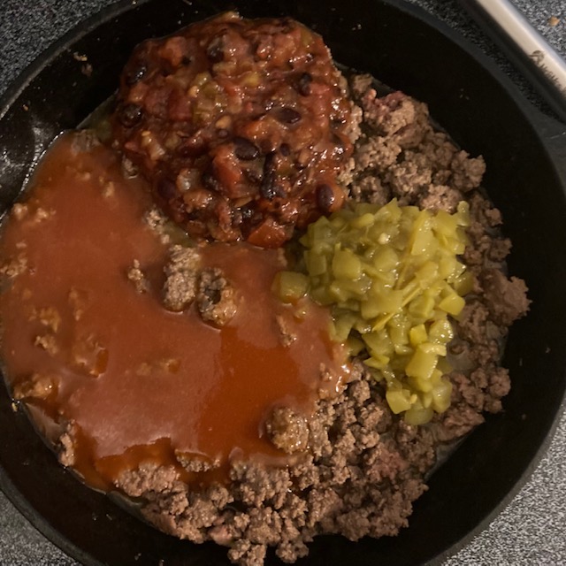 - Once the beef is brown add in the Salsa, Green Diced Chiles, & Red Enchilada Sauce. Mix this all together.