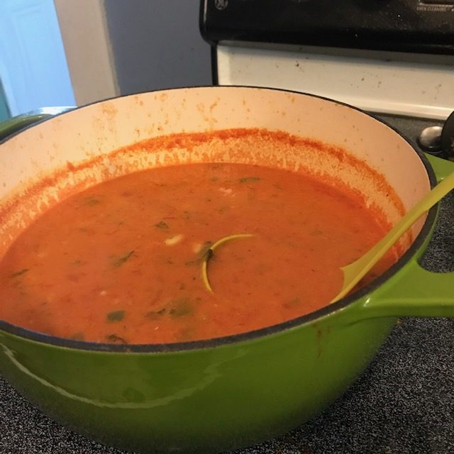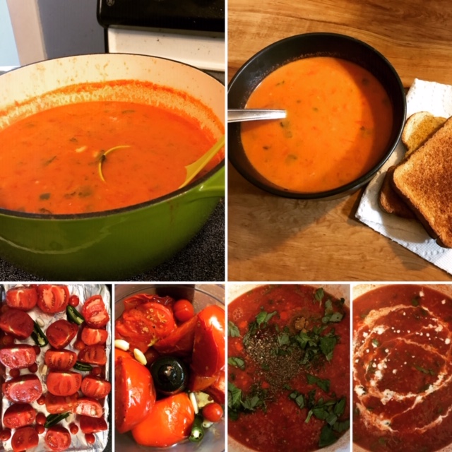 This takes about 4 pounds of tomatoes any type of tomato will do. I also make Fiery Tomato Bisque Fiery I added in some Jalapenos that were also from my garden. I also got to utilize my big green Dutch oven which made this easier to mix. This recipe is great because it was warming for the fall season, freezes well for later enjoyment, & goes well with a toasted cheese sandwich!