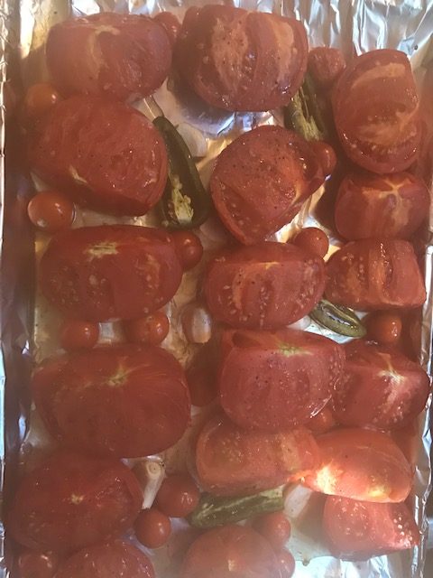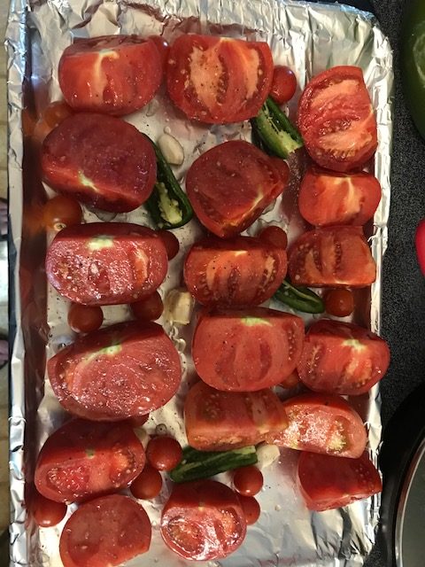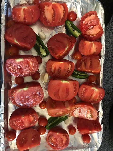 - Cut up the Tomatoes and slice up the Jalapenos. Take 4 garlic cloves out as well. Place them on the sheet pan.