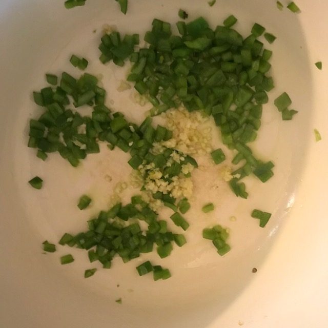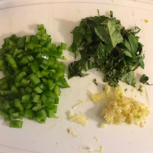 - While these are roasting dice up the green pepper, mince 3 more garlic cloves, and chop up the fresh basil.