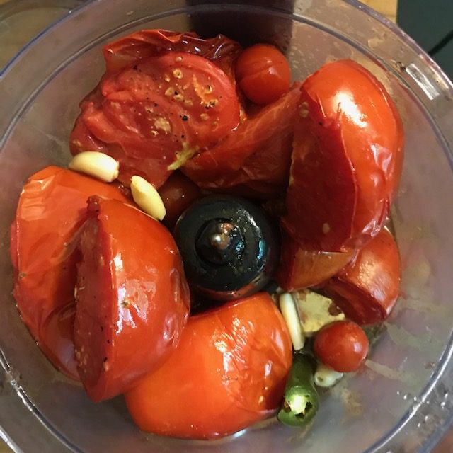 - Once the tomatoes are done roasting take all the ingredients from the pan and add it to a food processor. Remove the garlic from its shell.