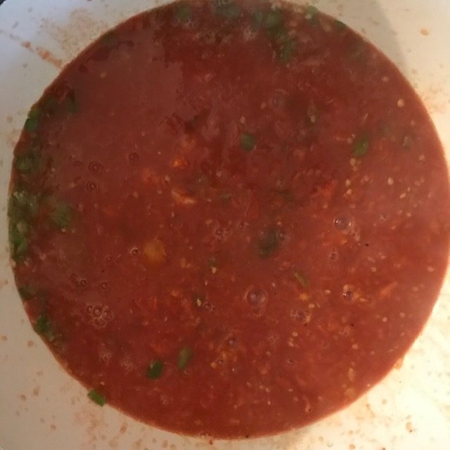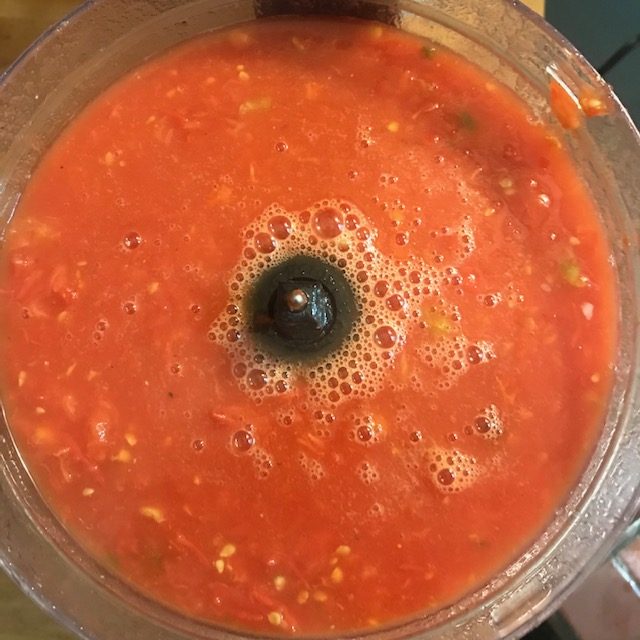 - Pulse the food processor on and off until everything is mixed into a thick soup.