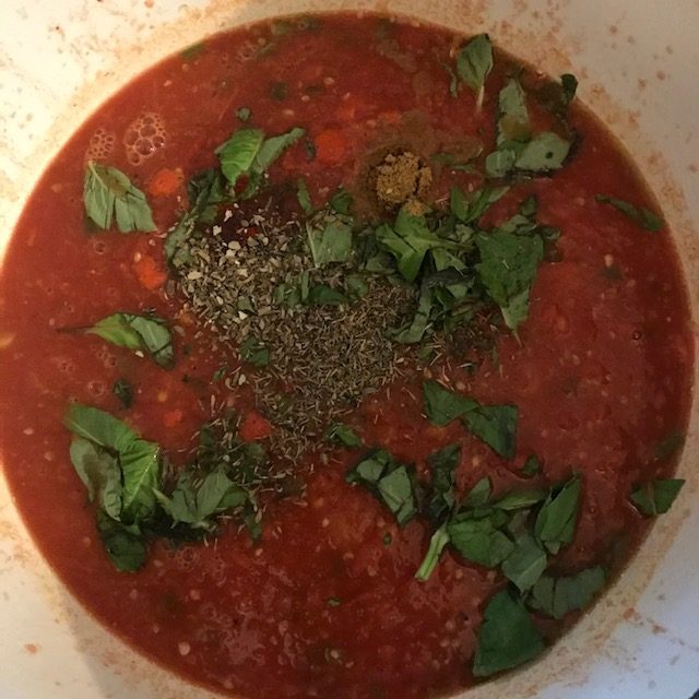 - Add in the Thyme, Smoked Paprika, Cumin, Dried Basil, Oregano, Tomato paste, and chicken broth.