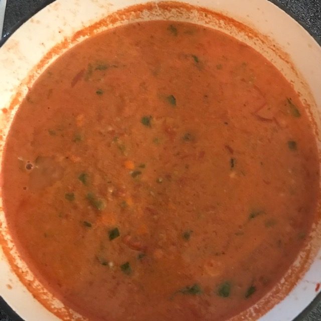 - Add the tomato mix from the food processor into the Dutch oven.