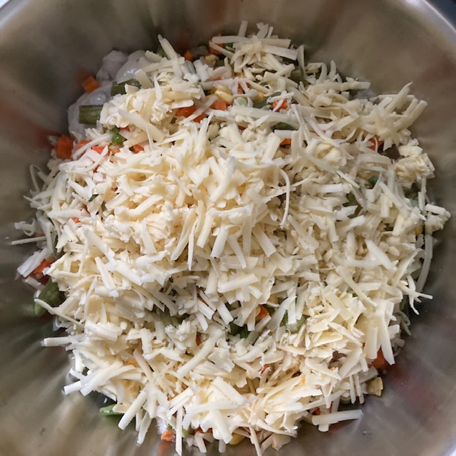 - Add in your mixed vegetables and half of your shredded cheese.