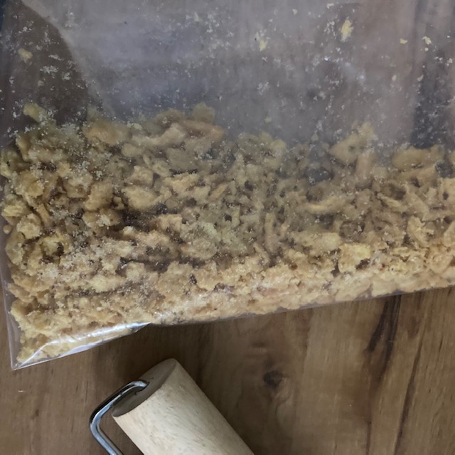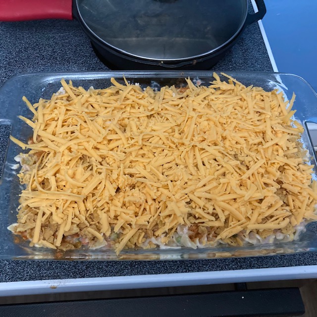 - Crush up your Fritos in a plastic bag and then sprinkle them as evenly as possible over the 13 by 9 casserole dish.