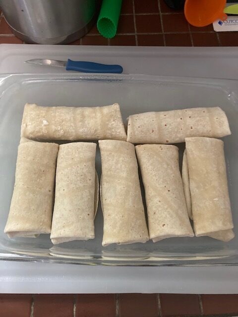 - Spray a 13 by 9 pan with cooking spray and place your burritos into the pan.