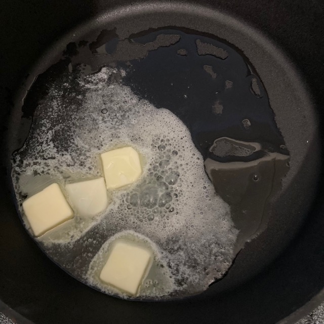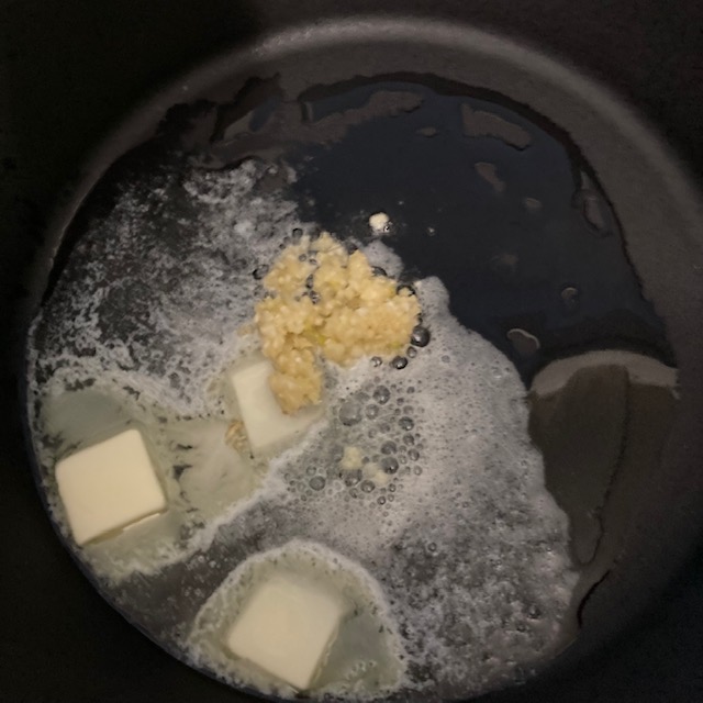 - In a large skillet saucepan over medium heat with a lid melt the butter with the Oil and Minced Garlic.