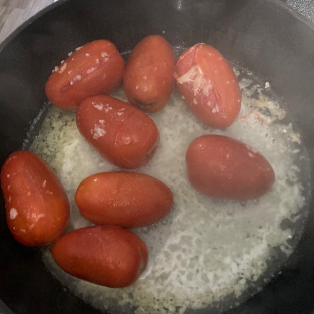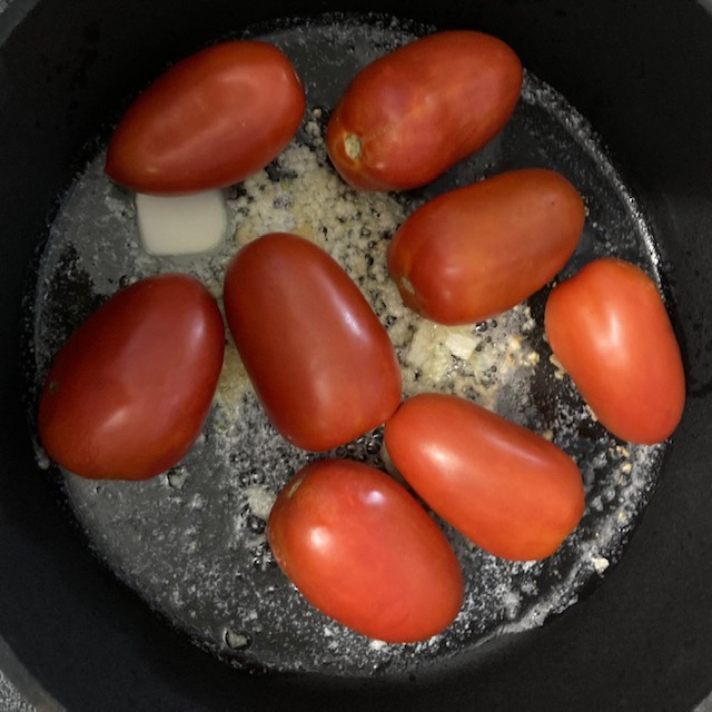- As soon as the butter is melted add half of the pasta water and the Tomatoes.