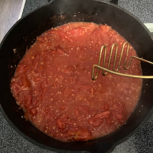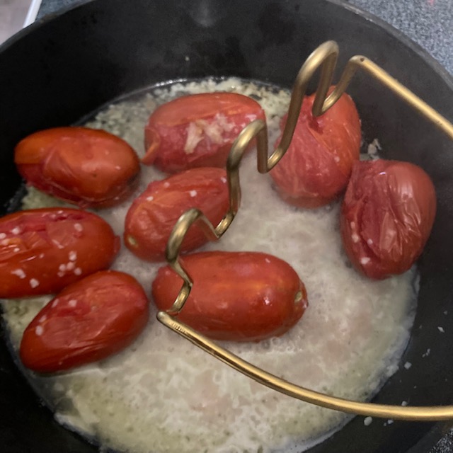 - Once the tomatoes burst takes a potato masher and mash up the tomatoes.