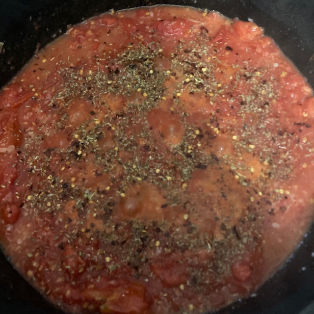 - Season the mashed tomatoes with Italian seasoning and red pepper flake. Mix in well.