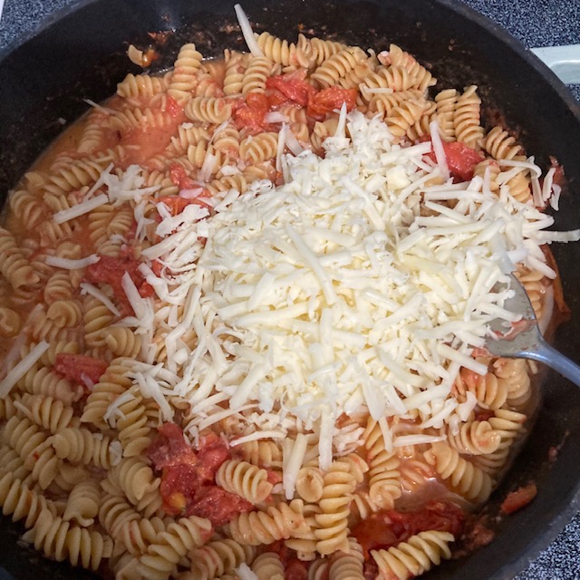 - Sprinkle in the mozzarella and let this melt into the pasta.