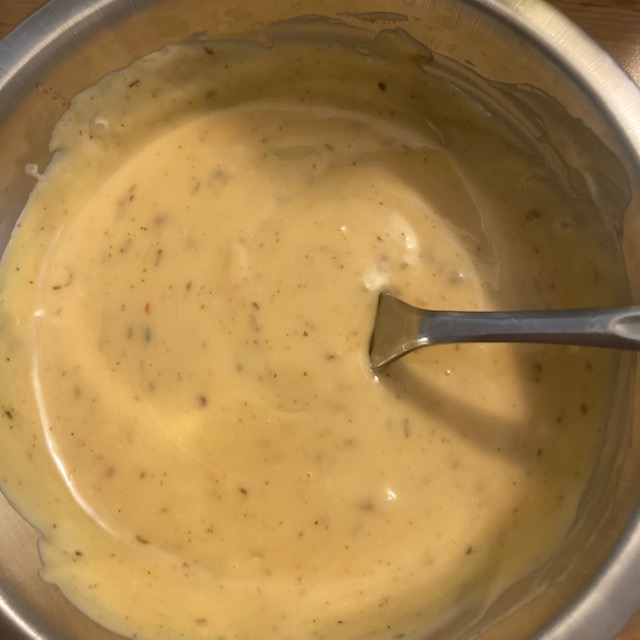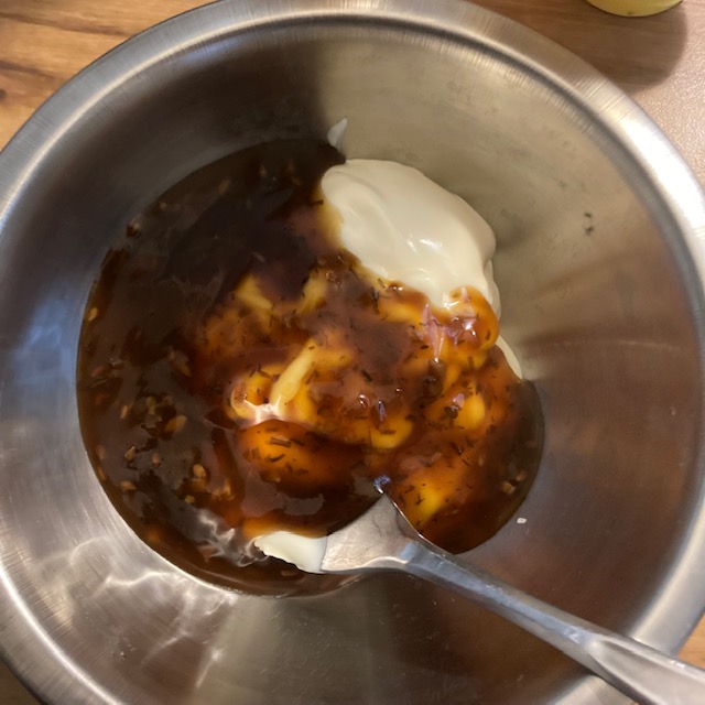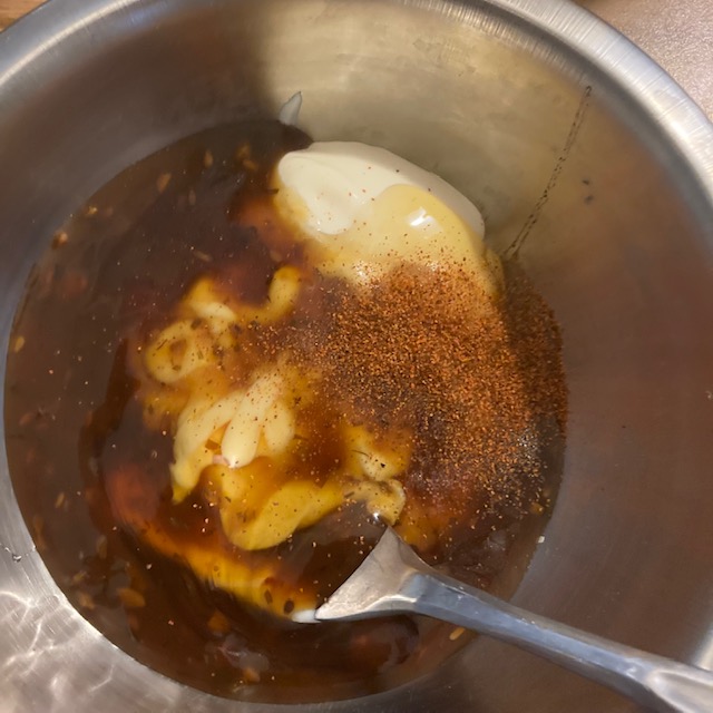 - Sauce first here. Mix in a small Bowl the Mayonnaise, Teriyaki sauce, honey, and a little cayenne pepper.
