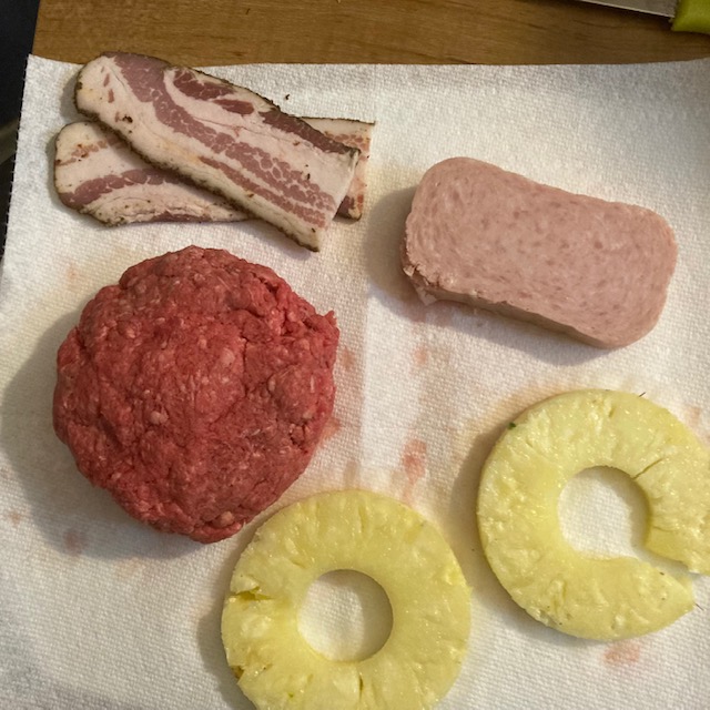 - Once those are cooked place the burger patty in the Pineapple slice, then the other pineapple slice followed by the SPAM.