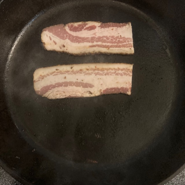 - Cut your piece of bacon in half and cook it in a skillet over medium heat.