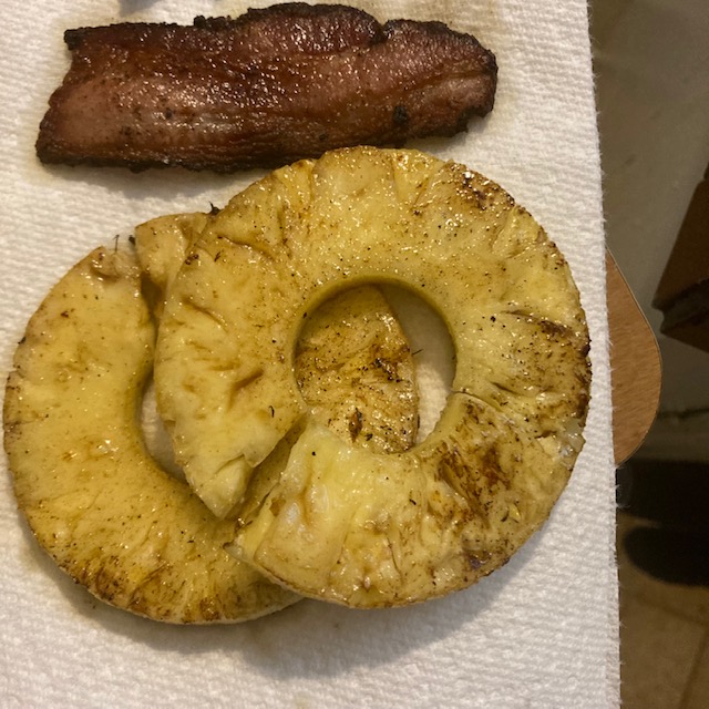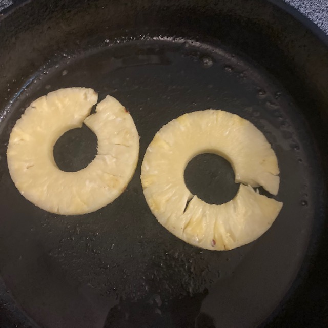 - Cut up a couple of slices of pineapple and heat them in the skillet to give them a little color.