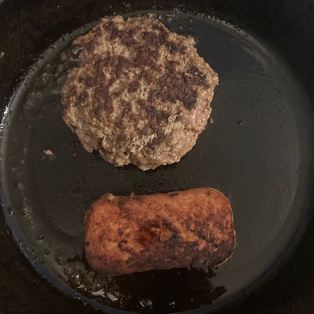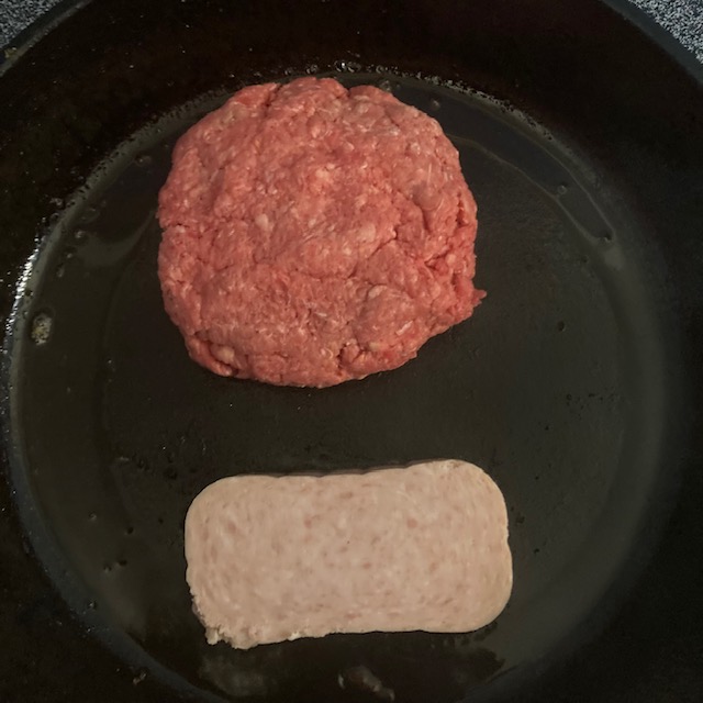 - Cut a slice of SPAM and form up ½ pound burger patty with the ground beef.