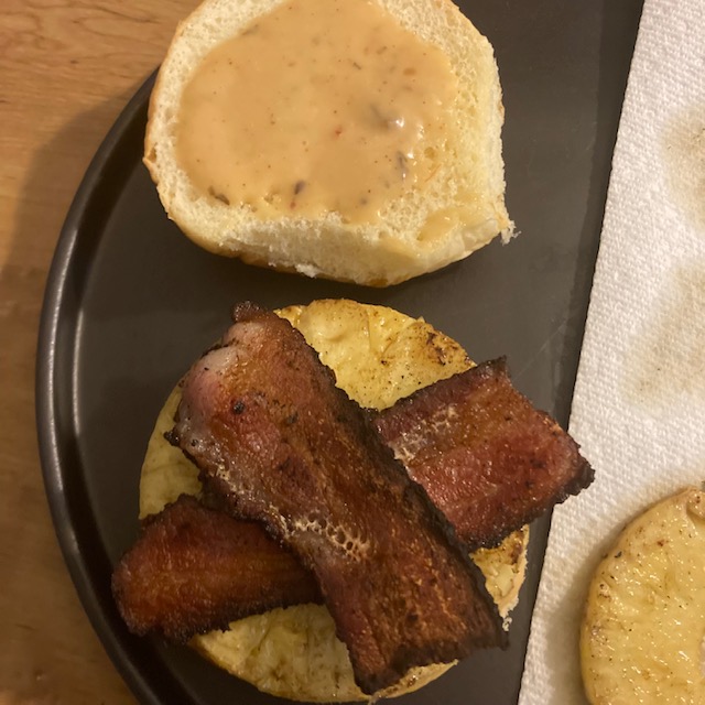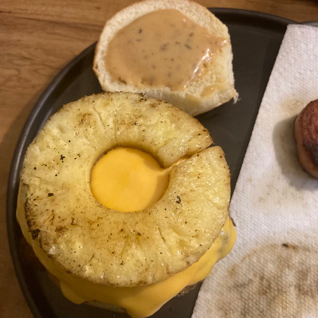 - Put the bacon crossed on the bottom bun and then one slice of the pineapple.