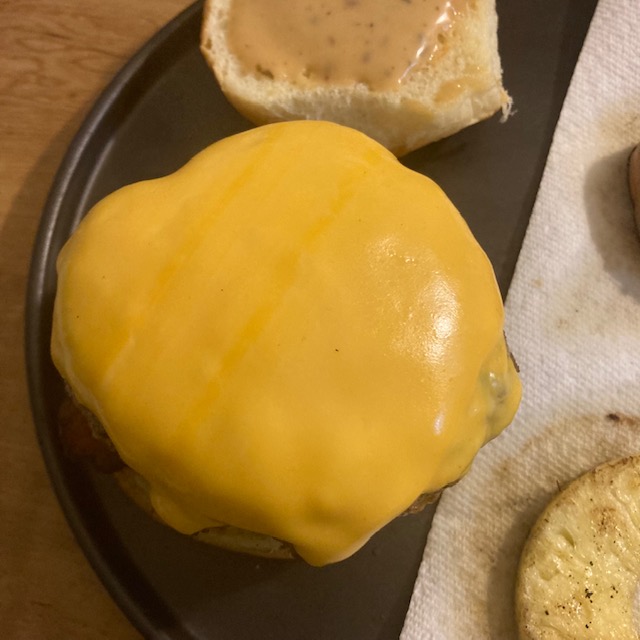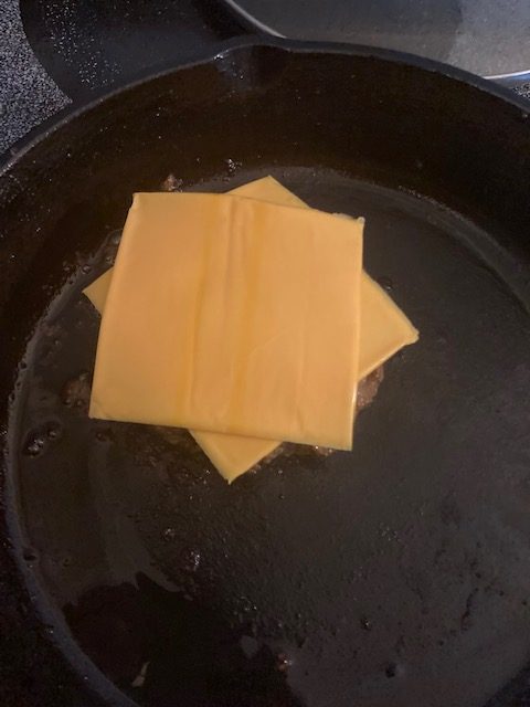 - The Burger cook how you would like it. I like mine medium, so just under 3 minutes a side with this size burger. The last few minutes place the American cheese on the burger to meltdown.