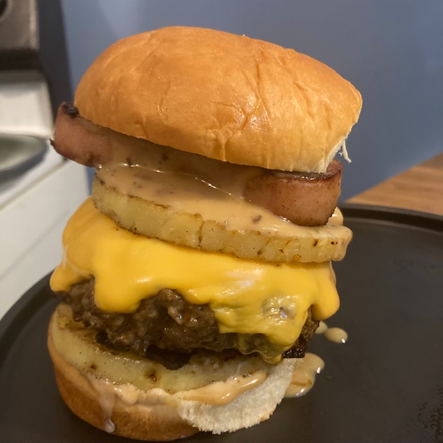 Hawaiian Burger is a simple fun recipe I did on a weekend for fun. Just gathered up the quintessential Hawaiian ingredients. You know the Kings Hawaiian buns, pineapple, & SPAM! Then I thought about a sauce that would work and of course some bacon! I know bacon and SPAM you may be judging me, but I think they both can live on the same burger! Give this one a go! Grill up your burger or do it in a skillet!