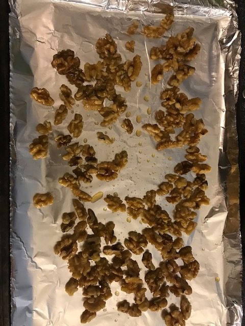 - Preheat oven to 350 degrees. Spread the walnuts over the cooking sheet and reserve the leftover whiskey for later.