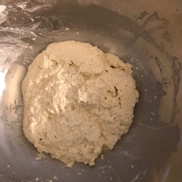 - Continue to stir and mix until all of the flour and water form into a dough ball that is slightly sticky.