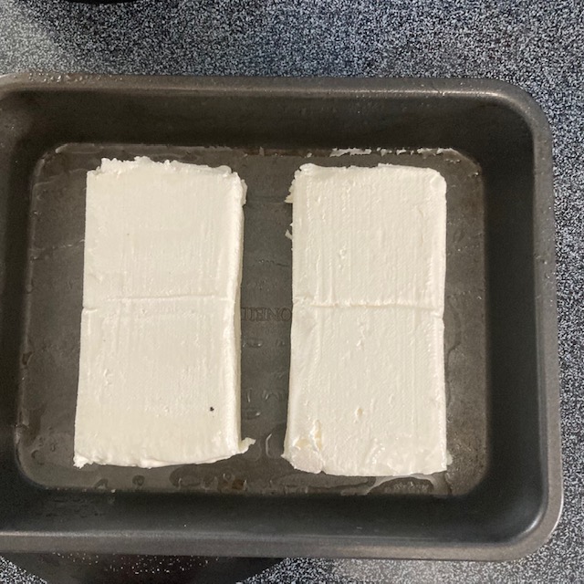 - Spray a pan with cooking spray and place the 8oz block of cream cheese into the pan.