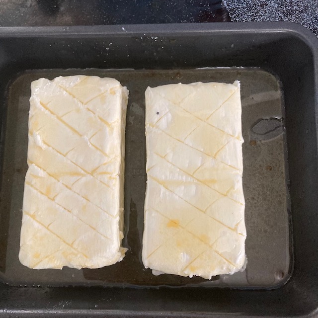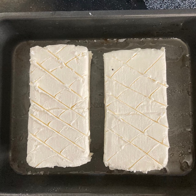 - Slice shallow cuts across the block of cream cheese.