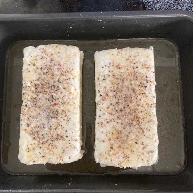 - Sprinkle the top of the cream cheese block with salt and pepper.