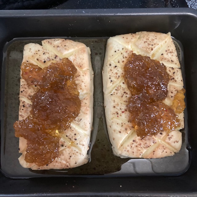 - At the end of the 2 hours take it out of the Oven and spoon on the Jelly.