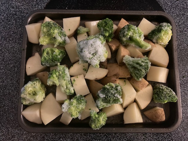 - Remove the potatoes from the oven and spread the broccoli in with the potatoes.