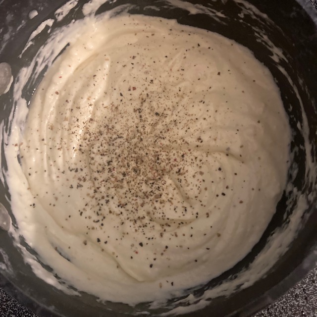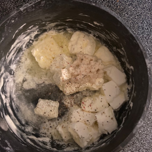 - Melt the Butter and Cream Cheese in the pot seasoning with Salt and Pepper to taste.