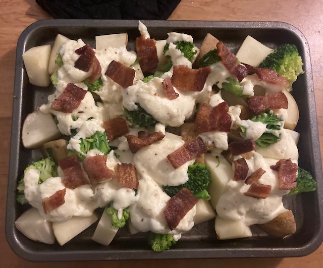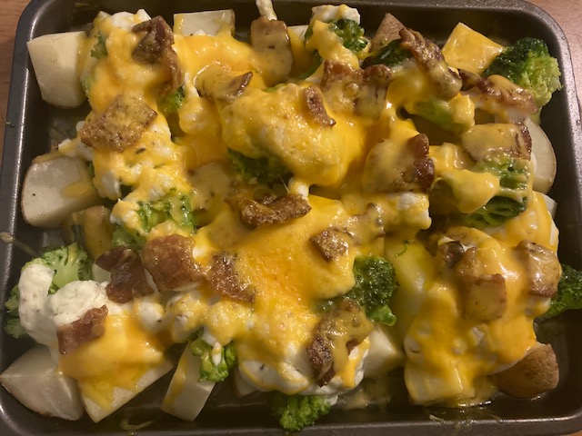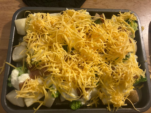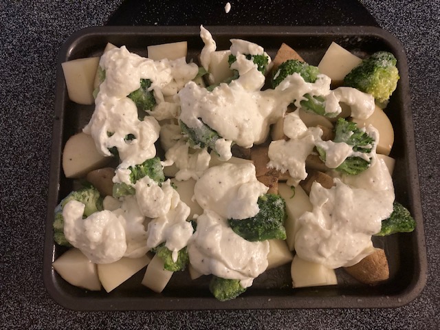 - Pour the Cream Cheese and Butter mix over the potatoes and broccoli.