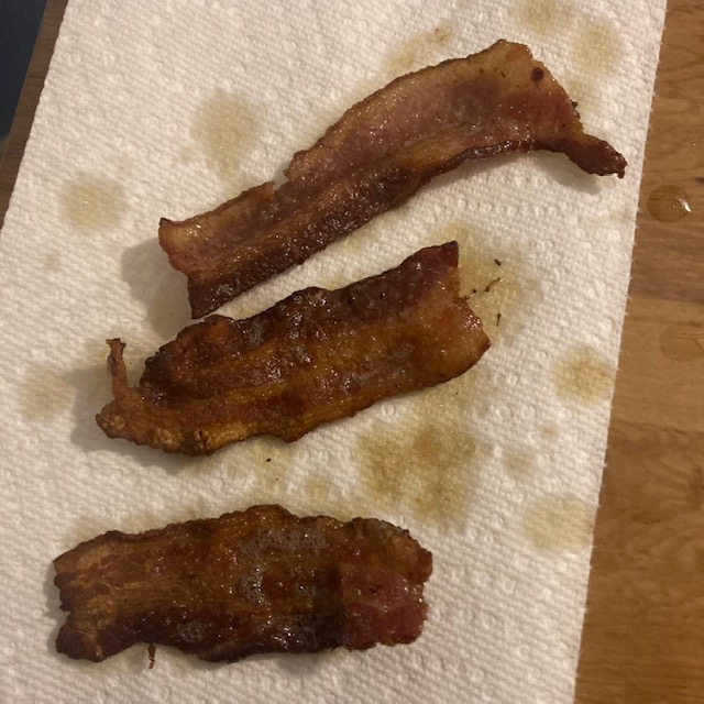 - Fry up the bacon in a pan and then let it dry and cool on a paper towel.