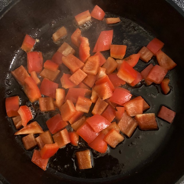 - Dice up a Red Bell Pepper and then heat a skillet to medium heat.