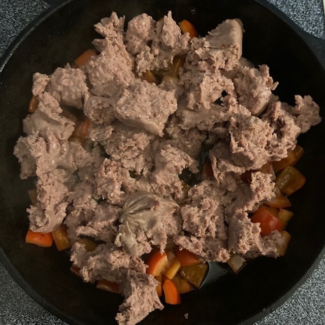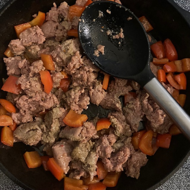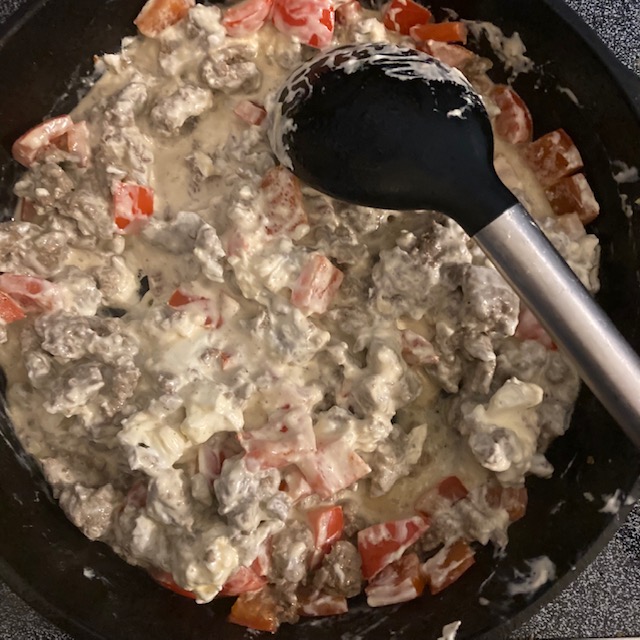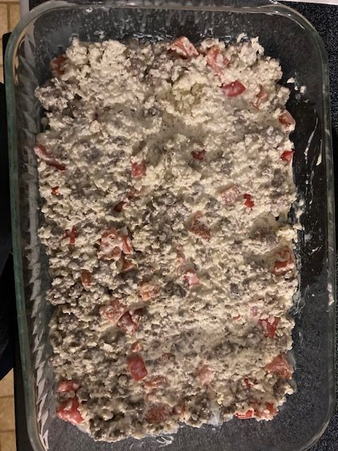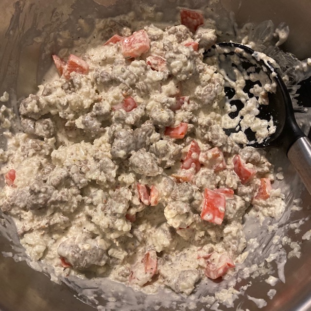 - Mix the Cream Cheese in with the Sausage and peppers until it is all melted and combined.