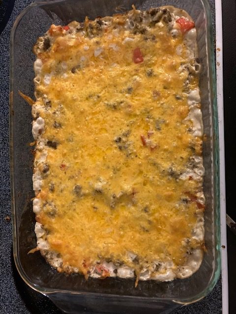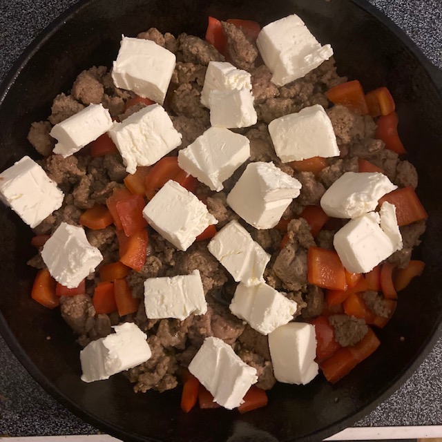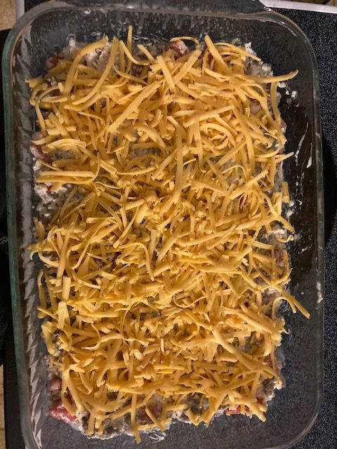 - Sprinkle the Cheddar Cheese over top of the sausage and cauliflower mixture.