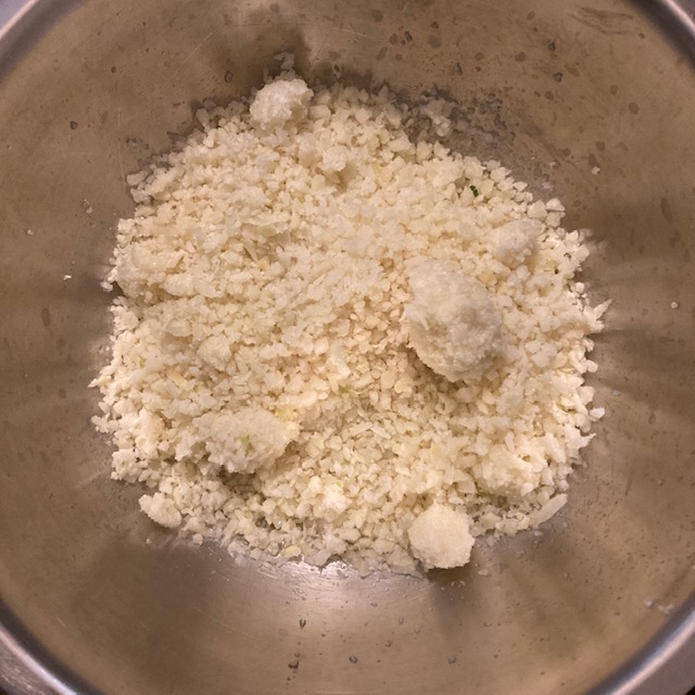 - In a large bowl put in the Riced Cauliflower. If it is frozen brake it up in the bowl with a fork or your hands.