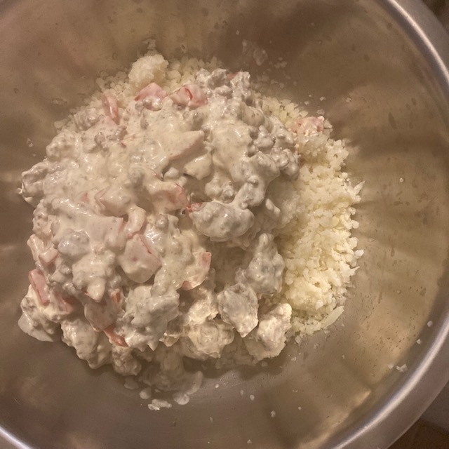 - Now Pour the Sausage mixture into the large bowl with the Riced Cauliflower.