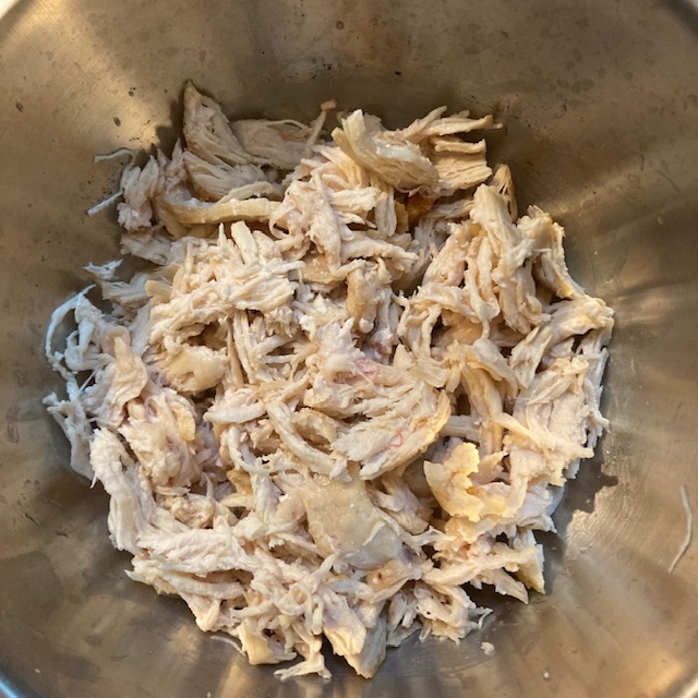 - Cook and shred the Chicken. Place in a bowl and refrigerate for an hour.