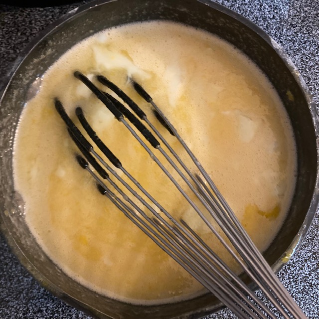- In a large saucepan add in the Butter, Sugar, Light Corn Syrup, eggs, & vanilla. Set the heat to medium-high.