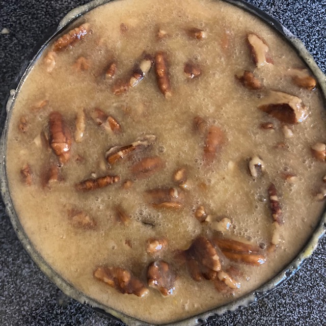 - Pour the Pecan Pie mix over top of the brownies and spread as best you can across the top of the brownies.