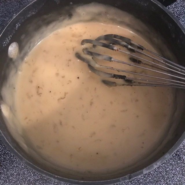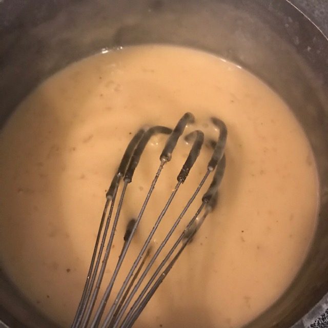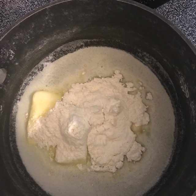 - When the butter is about done melting add in the flour and then the beef broth.