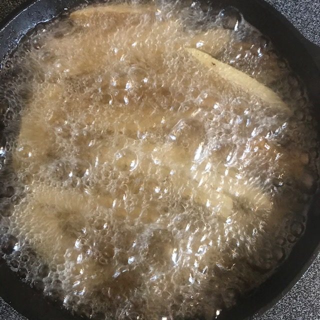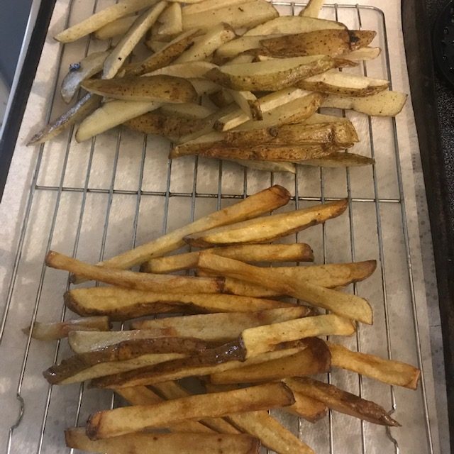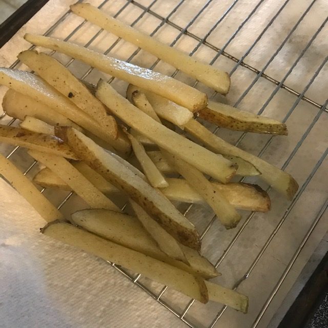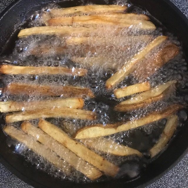 - For Double frying add the peanut oil to a cast-iron skillet and bring the oil to 325 degrees Fahrenheit. Add the fries and let them fry for about 7 to 10 minutes. Remove from oil and let cool on a rack over paper towels.